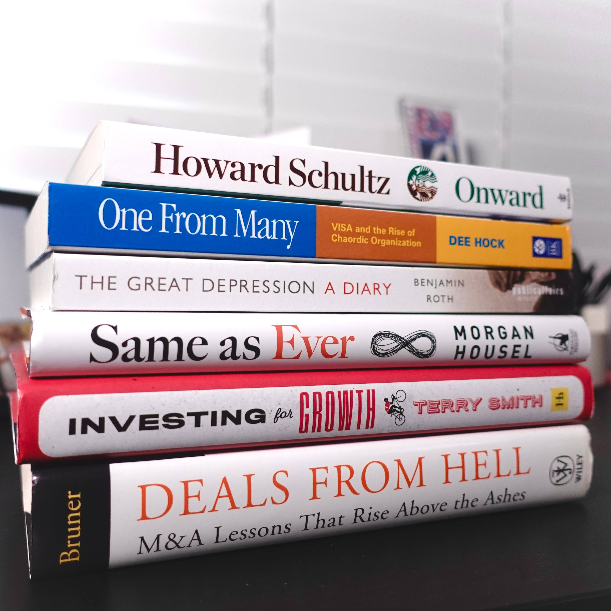 Out of that stack, I'm planning on starting with Onward by Howard Schultz, which details his return as the CEO of Starbucks in 2008. Since Starbucks is a big deal in my portfolio, diving into the CEO's story is exciting to me, and I know I'll learn a lot by reading about the company from the person who built it.